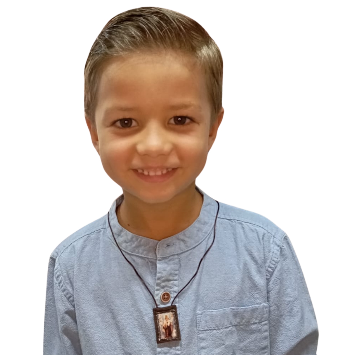 Escapulario Infantil em tecido de Nossa Senhora do Carmo, com tamanho 2,5 x 3,5cm e cordão de 30cm