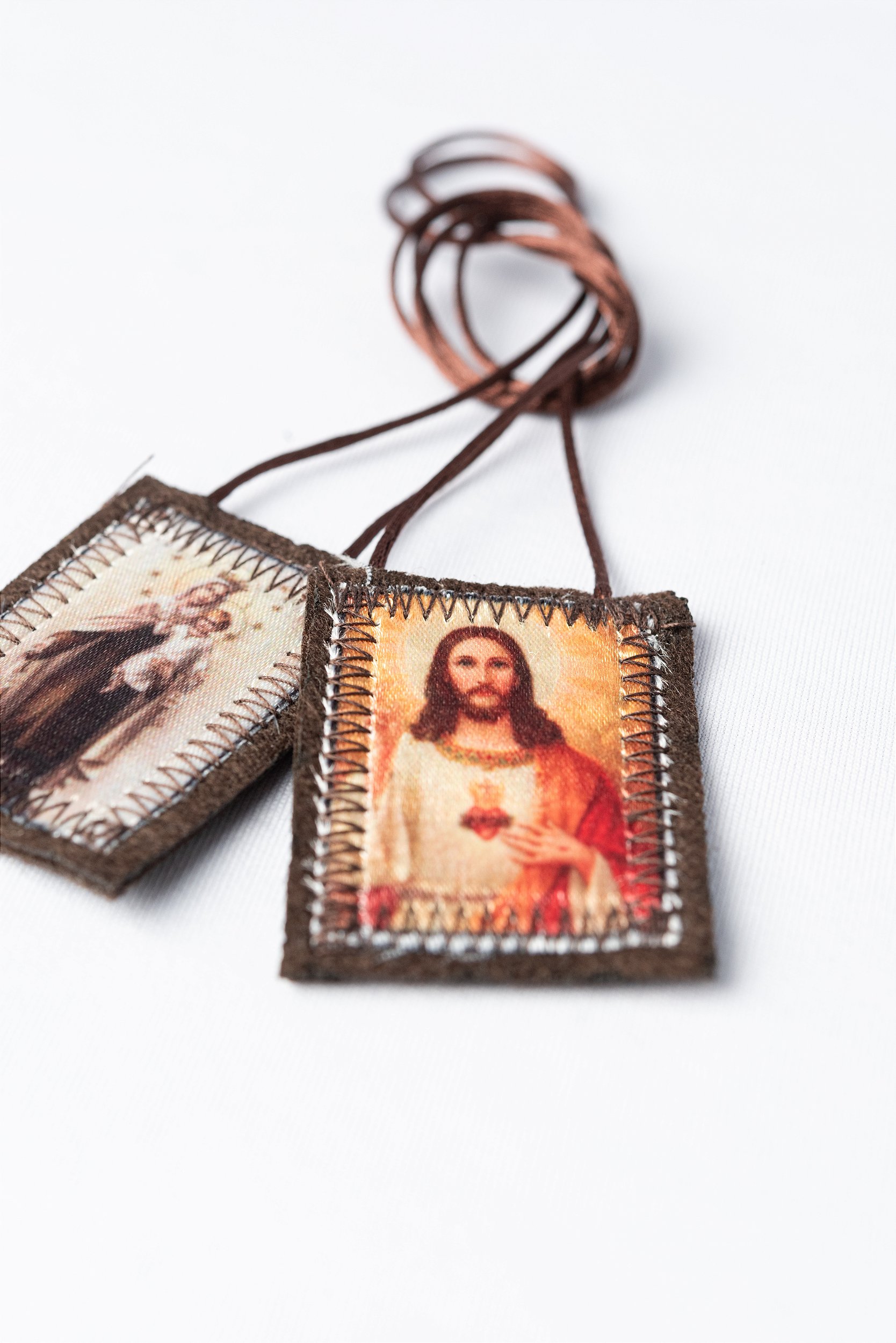 Escapulario em tecido de Nossa Senhora do Carmo, com tamanho 3,5 x 4,5cm e cordão de 40cm